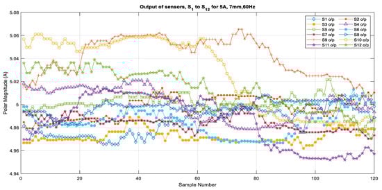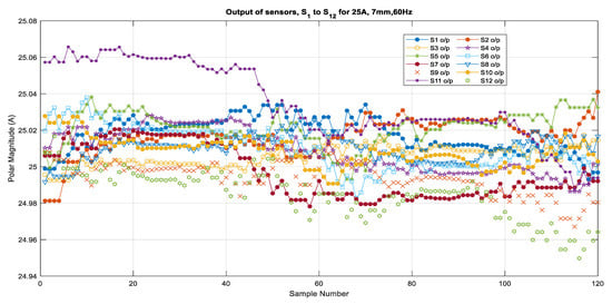 Based on the calibration for individual sensors, the current output was calculated from the measured magnetic field that was generated by the 60 Hz source currents varying from 5 A to 25 A when the sensors were placed at a distance of 7 mm from the center of the conductor. The algorithm then used the multiplying factors that were obtained from the calibration to compute the current phasors for the selected samples from the validation set of measurements. Figure 5 shows the outputs of all of the sensors for 5 A, 10 A, 15 A, 20 A, and 25 A as subplots. Figure 6 and Figure 7 show the outputs for all of the sensors for 5 A and 25 A for 120 samples (1 cycle of 60 Hz). These figures show an enlarged view of the outputs of each sensor. Figure 6 shows that the outputs are scattered over a bigger range from 4.95 A to 5.06 A and that the outputs are not very consistent, the reason being that the magnetic field is weak when it is generated by a 5 A source. However, it can be observed in Figure 7 that the outputs are very close to each other and are very close to the 25 A value, with a very minor variation that ranges from 24.98 to 25.04 for all of the sensors, except S1 and S12, which also show a larger variation for 5 A. From these figures, it can be seen that all of the sensors except S1 and S12 show very good and similar performance for higher current values. It can be seen that the outputs are well within the limits of ±0.2 A. This means that irrespective of the sensor quality, the output of the sensors does not vary from the actual value too much because of the use of the multiplying factors of each sensor.