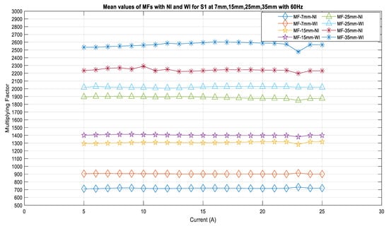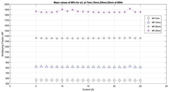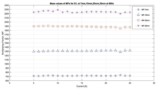 Figure 9 shows the results of the multiplying factors that were obtained for the sensor S3, which were similar those obtained in the different cases for S1. This figure also shows that sensor S3 has smaller values for the MF current and for the sensor distance from the source compared to those of S1. For 7 mm, the range of the MFs is between 550 and 560. For 15 mm, the MFs have almost equal values, all of which are close to 800. For 25 mm, these MFs increase significantly and are in the range of 1360 to 1370, whereas for 35 mm, the values are in the range of 1870 to 1880. As explained in Section 4.1 the sensors will have varying MFs based on their quality and their distance from the source, but it is clear that the outputs do not exactly follow the theoretical relationships between the current and the sensor distance from the current source. It can be concluded from the analysis in this section that when the sensors are closer to the source (conductor), the magnetic field is strong, and therefore, the sensors will provide consistent results, whereas when the magnetic field becomes weaker when the distance increases, it is only the higher currents that will produce better results.