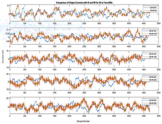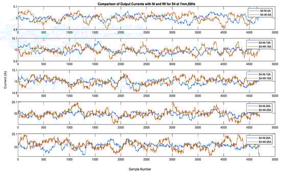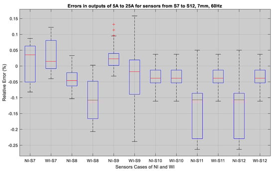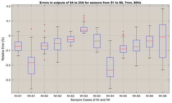 Figure 11 shows the output of sensor S3 for currents obtained in the No-Insulation compared to the With-Insulation case. The performance of sensors S5 and S4 for the c 5 A, 10 A, 15 A, 20 A, and 25 A currents is shown in Figure 12 and Figure 13. It can be seen that the output errors do not cross the limit of ± 0.1 A for five of the current values in both the No-Insulation and With-Insulation cases. However, more accurate values can be obtained for the No-Insulation case compared to the With-Insulation case. The relative percentage errors between the CT output and the sensor outputs were calculated for both the WI and NI cases for all of the sensors by considering the distance of 7 mm and input current frequency of 60 Hz. The results for all of the sensors are shown in Figure 14 and Figure 15 as box and whisker plots.
