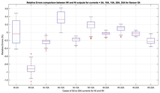 These relative errors were also compared on the basis of the performance of each sensor for a specific source current value as well as for the WI and NI cases. The results are shown by the box and whisker plot in Figure 16. The median value for all of the currents for NI the case shown in Figure 16 is very close to 0%, whereas the median varies with the range from 0.3–−0.2% for the WI case. In all of the NI cases, the error for 5 A was 0.5% when considering the fact that the sensors are less accurate at lower current values since their rating is for 300 A. It is evident that for 25 A, the error rate for all of the sensors is 0.01%. In case of WI, the error value is 0.6% for 10 A; however, it is −0.001% for 25 A. This indicates that the sensors will be accurate when they are used for higher current applications.