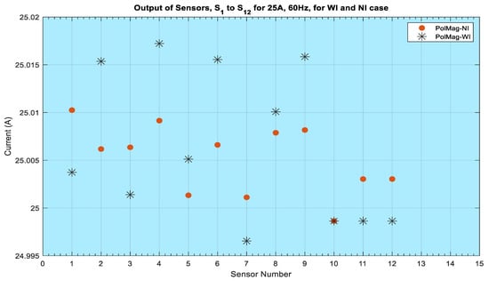 Output of all sensors for 25 A, 7 mm, 60 Hz: WI and NI cases.