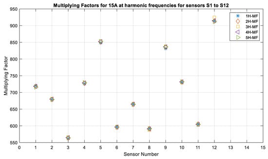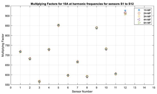 The last factor that was studied was the performance of individual sensors in the presence of harmonics. In this case, the application of the sensors is considered for medium-voltage power systems that often have the odd harmonic present in the system. Generally, the protection relays and instrumentation meters eliminate any harmonics that are above the 5th harmonic. Therefore, in this study, the sensor performance was tested for harmonics up to the 5th order. Figure 18 and Figure 19 show the multiplying factors that were obtained for twelve sensors for currents with the frequencies from 60 Hz to the 5th harmonic, and it can be seen that these are almost the same, with a very small variation for 10 A current being observed. There was less variation for 15 A compared to that for 10 A. It was observed that vibration was minimal for the higher currents. The sensors were able to measure the currents with harmonic frequencies as accurately as they were able to measure the fundamental frequency.