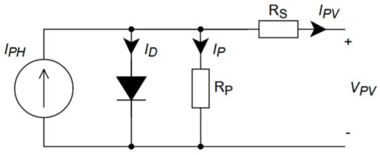 Solar cells can be represented by using a simplified single-diode equivalent circuit [28], as shown in Figure 4. The amount of current produced by the source is directly proportional to the amount of illumination incident on the solar cell. The purpose of the diode shown in Figure 4 is to limit a current in one direction, so that the solar cell will not use energy when it is shaded or at night. A solar cell experiences parasitic resistances that limit the amount of power delivered by the device. These resistances define the quality of the electrical connection within the cells. A parallel resistance (RP) should be maximized to prevent the flow of the current through any circuit elements but the diode. The series resistance (RS) should be as low as possible to minimize unwanted power dissipation [29].