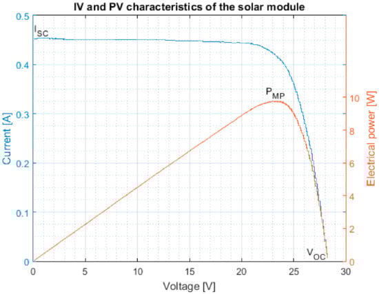 The highest possible current generated by the solar cell is called the short-circuit current (Isc). This is the current when the solar cell is in short-circuit mode. Another characteristic point is the open-circuit voltage (Voc), which is the maximum voltage on the cell when no load is connected to the cell. There are also two additional parameters that characterize a solar cell. The first one is the fill factor (FF), which in conjunction with the VOC and ISC determines the maximum power provided from the solar cell. The second one is efficiency (η), which is defined as the ratio of the output energy from the solar cell to the input energy from the sun. All four parameters can be determined from the input voltage (IV) [30]. The IV and the corresponding power voltage (PV) for the exemplary solar module, consisting of more solar cells, are shown in Figure 5.