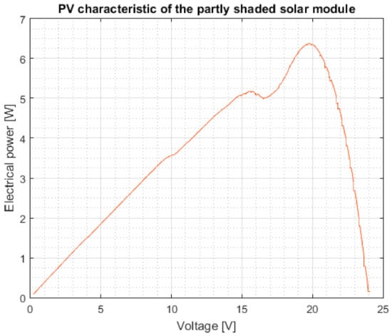 PV of a solar module in partly shaded conditions. More local MPPs are visible.