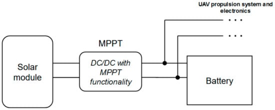Simplified schematic of the UAV power supply system with the solar module and MPPT included. The output of the MPPT is connected in parallel to the battery, UAV propulsion system and main electronic power supply line.