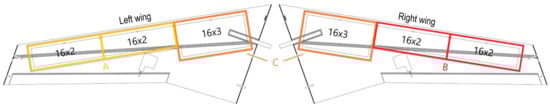 As shown in Figure 8, there are three separate solar module chains. The chain of two 16 × 2 modules connected in series on the left wing is assigned as chain A, the chain of two 16 × 2 modules connected in series on the right wing is assigned as chain B and the chain of 16 × 3 modules connected in series is assigned as chain C.