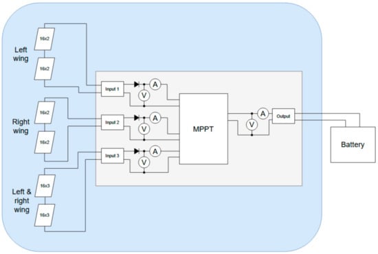 Six single-junction GaAs-type solar modules used for the endurance extension of the Bramor UAV were produced from Alta Devices, Inc. In the model, four modules consist of two parallel chains of sixteen solar cells (named 16 × 2) connected in series and two modules consist of three parallel chains of sixteen solar cells (named 16 × 3) connected in series (Figure 8). On each wing, both modules of the same size (16 × 2) are connected in series to achieve a higher voltage and consequently lower transmission losses. For the same reason, a 16 × 3 module on the right wing is connected in series with a 16 × 3 module on the left wing.