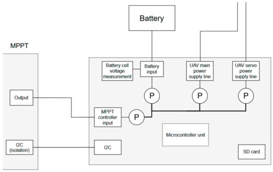 Since the power consumption of the UAV is much higher than the solar modules can produce, the battery still discharges during the flight. It is important that there is no fail-safe that can disable the functionality of the MPPT for this reason. A detailed schematic of the endurance extension system is shown in Figure 10.