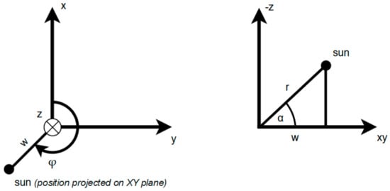 In order to find the angle between a sun ray and the normal vector of the solar modules plane, we have to convert both vectors into the same three-dimensional Cartesian coordinate system. The position of the sun, which can be calculated mostly using trigonometry equations [67], is normally given in the horizontal coordinate system with two angular coordinates—azimuth (φ) and elevation (α) [68]. A transformation is shown in Figure 14.