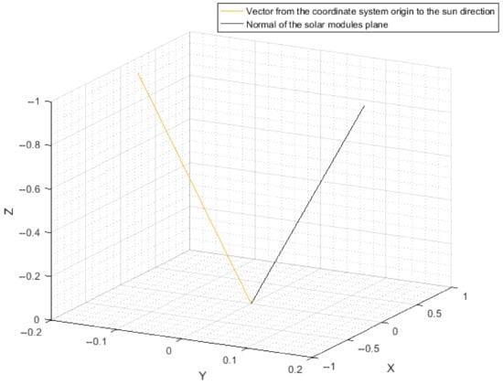 As shown in Figure 9, solar modules are mounted on both wings of the Bramor UAV. We can consider that all solar modules together represent a plane. Since modules are mounted on the relatively straight parts of the wings, any curvature can be neglected. A normal vector of the solar modules plane is pointed upward (Figure 13) in the reverse direction of the UAV coordinate system’s z-axis. If we consider that the sun is always at a certain position in the sky and that the UAV is rotating around its axis, the projection of the direct sun rays onto the solar modules will change according to the angle between the direct sun rays and the normal vector of the solar modules plane. The calculation of this angle is a crucial step in the calculation of the electrical energy production. We can omit the flight altitude in this calculation, since the flight altitude of the UAV is significantly lower than the other distances considered.