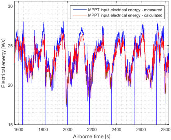 Comparison between the measured and calculated electrical energy values at the input of the MPPT during a short segment of the flight performed on 3 September 2021.