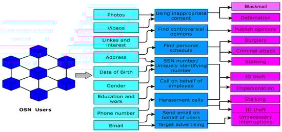 Users’ photos and videos from their profiles could be doctored and used for blackmailing and defaming individuals []. Likes and interests reveal a lot about a person, and can lead to the revelation of controversial opinions. The address of a person can reveal their location, resulting in a criminal attack or burglary []. An individual’s social security number (SSN) can be determined using a combination of address, date of birth, and gender, resulting in ID theft or impersonation []. Companies may use e-mails and phone numbers for targeted advertising, leading to unnecessary interruptions and spam. Therefore, it is an open challenge to protect confidential and sensitive data from unauthorized persons, and to ensure that the actual data are available only to legitimate users [] of OSNs.
