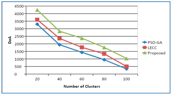 Figure 3 demonstrates the outcome of DoA for varying cluster size scenarios using PSO-GA, LECC, and the proposed method.
