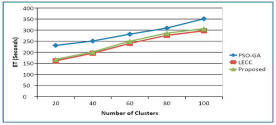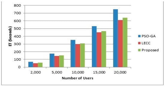 As shown in Figure 8, we observed a significant increase in execution time with increased user density. LECC showed the minimum ET compared to the proposed method and PSO-GA.