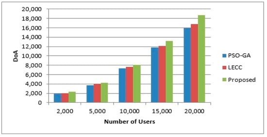 This analysis aims to compare the performance of PSO-GA, LECC, and the proposed method based on the condition of the user density variation. We varied the user density from 2000 to 20,000 for that purpose, with a constant cluster size of 100. The clusters produced can be more significant if we give a greater number of users. Therefore, we ranged the user density from 2000 to 20,000, and conducted our investigations. Figure 6, Figure 7 and Figure 8 demonstrate the outcome of this experiment for the parameters DoA, IL, and ET, respectively. Figure 6 indicates that DoA increased with the increase in user density.