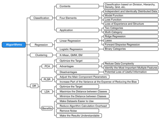 Machine learning tasks and the main algorithms are shown in Figure 7 [81,82]. Four main tasks in machine learning include classification, regression, clustering, and DR (dimensionality reduction). Of these, supervised learning models have the classification and regression. Clustering belongs to unsupervised while DR belongs to both supervised and unsupervised learning.