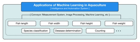Figure 8 shows an overview of applications of machine learning in aquaculture systems. In general, machine vision/computer vision is the main tool to measure the size of fish. Images are taken through a camera that are attached in a fish measurement system and then all collected images are sent to software and are analyzed and then the results compiled [81,82,83,84].