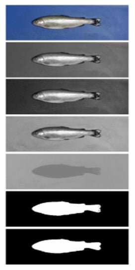 Related to this approach, Costa et al. [85] conducted an experiment with aim of this study is to develop methodology tools to directly measure size, identify sex and recognize the abnormal performance of seabass (Dicentrarchus labrax L.) in online conditions in an aquaculture farm. The seabass samples are taken from five crossed population from the wild in European. There are 259 fish photographed and weighed individually with minimum weight 0.1 g. Elliptic Fourier analysis (EFA) on the outline coordinates is used to analyze the fish shape. The original images are transformed by two channels such as G (gray scale) and V (value) channel in the HSV color space.