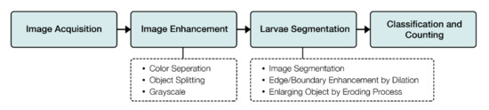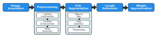 Meanwhile, Sanchez-Torres et al. [89] collected information from many works in the literature related to machine vision and then conducted a new concept for this field based on the existing information. It is a suitable system for measuring fish by using a single camera to take the photo in a controlled setup because it can manage better sample size and good condition images. Furthermore, a combination of homomorphic filtering, contrast limited adaptive histogram equalization (CLAHE) and guided filtering for fish image enhancement was used. The whole procedure to measure fish is shown in Figure 15 [89].