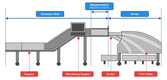 Fishes are transferred to the conveyor belt to measure and grade. As fish and their length are detected by image processing, the location of the grader is managed by the length classification (Figure 17) [90].