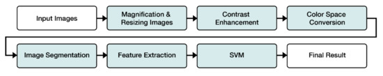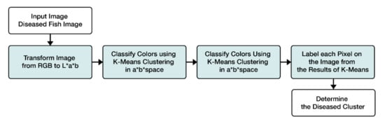 Chakravorty et al. [94] identified four infected EUS species such as Clarias batrachus, Puntius chola, Labeo bata and Labeo gonius from different parts of the Barak Valley, Assam. They used two kinds of machine learning algorithms including Principal Component Analysis (PCA) and K-means clustering with a flow chart for experiments showed in Figure 19 and Figure 20, respectively [94]. The results showed that the algorithm has more than 90% accuracy for PCA. In conclusion, for detecting skin color and extracting texture feature, HSV is a good choice. For detecting fish pathogen and extracting brain tumor, morphological operation should be used.