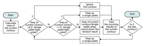 - Cao, J.; Xu, L. Research on counting algorithm of residual feeds in aquaculture based on machine vision. In Proceedings of the 2018 IEEE 3rd International Conference on Image, Vision and Computing (ICIVC), Chongqing, China, 27–29 June 2018; pp. 498–503. [Google Scholar]