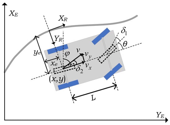 is the rotation matrix; denotes the velocity vector consisting of the longitudinal linear velocity and lateral velocity ; denotes the CLMR’s wheelbase; denotes the CLMR’s front steering angle; denotes the rotational velocity of the front steering wheel; and denotes the front slip angle.