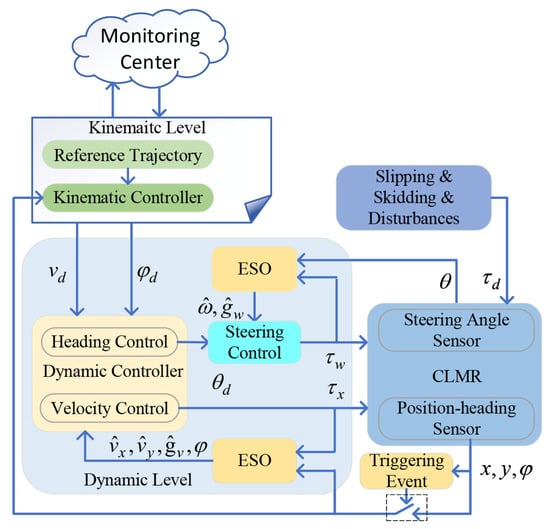 A variety of control strategies is utilized to achieve optimized performance. In [,,,], path following and tracking control schemes were respectively developed for CLMRs and four-wheeled WMR by using the back-stepping method. In order to obtain the global optimal solution, neural-dynamic online optimization-based model predictive control (MPC) schemes were presented for the path tracking problem and formation control of CLMR in [,]. In [,], hierarchical fuzzy decentralized sliding mode controllers (SMCs) were developed for the CLMR trajectory tracking, where the mathematical model was no longer required and the motor dynamics were sufficiently considered in the controller design. The model uncertainties and external disturbances were estimated by using linear ESO and compensated on the kinetic level. It is worth noting that the conditions of non-skidding and non-slipping should be satisfied in the aforementioned result [,,,,]. However, the assumptions cannot be met when the CLMR works in the environments, such as on the icy roads, the wet roads, and the forestry roads. The stability and performance may consequently no longer be guaranteed. To address the slipping and skidding problem, tracking controllers were presented for WMRs with longitudinal and lateral slippage based on improved linear active disturbance rejection control (ADRC) in [], a disturbance observer in [] and the reinforcement learning method in []. In the existing results [,,,], the virtual velocity input or given velocity is unlimited, which means that negative longitudinal velocity may come out during movement. Noting that it violates the traffic flow theory in the application of WMRs such as logistics system and self-driving automobile, which intensifies the potential collision risk, it is highly desirable to develop a tracking control scheme with velocity constraints.