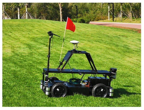 A differential global positioning system (DGPS) module is utilized to obtain the position-heading information with 5 Hz sampling rate and a precision of cm in the practical experiment. The information is exchanged to the controller, which is realized on a platform with STM32F429, through a RS232 interface. The control period is set as 0.01 s in order to be consistent with the simulation. The experiment is carried out on the grass with uneven ground and slopes at different angles. The coordinate center is selected on the location [36329 N, 1164714 E], and the same trajectory is selected as that in the simulation.