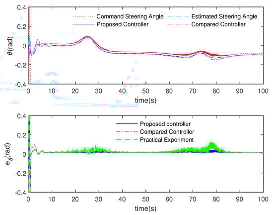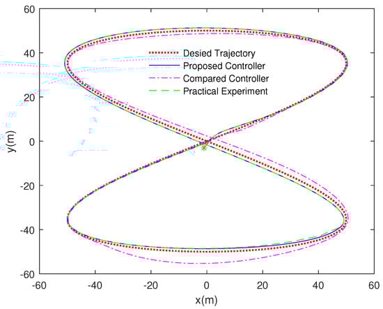 Experimental results of the aforementioned controllers are illustrated in Figure 4, Figure 5, Figure 6, Figure 7 and Figure 8. Specifically, Figure 4 shows the trajectory of CLMR, which is guided to track a preset parameterized path. It can be observed that the tracking control is achieved, regardless of skidding and slipping as well as unmeasured velocity information. Better tracking performance is achieved with the proposed controller. The tracking error in the practical experiment is appreciably increased because of the fact that the position information is not compensated when traveling on the sloping terrain.