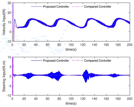 Figure 5 depicts the heading angle and heading error. The performance of the proposed controller is obviously better, which means a smaller yaw amplitude. Figure 6 shows the steering angle. Figure 7 shows the longitudinal and lateral velocities, illustrating that the proposed ESO can recover the velocities and estimate the unknown disturbances effectively. Figure 8 depicts the control inputs for velocity and steering, and both the control inputs are bounded. The performance seems almost similar to that in Figure 5, Figure 6, Figure 7 and Figure 8; another major advantage of the proposed controller is the communication times, listed in Table 2. One finds that communication times are variously reduced by using the event-triggered controller, and varies depending on different parameter settings.
