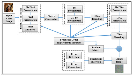 The block diagram of the proposed cryptosystem illustrated in Figure 2 consists of four main phases. In the first phase, the input color image is diffused through pixel level encryption stage, which is based on the generated fractional order hybrid chaotic map discussed in the first part. For more randomness to increase the efficiency of the encryption, the second phase, bit level permutation diffuses each bit from the output of binary conversion. In the third phase, DNA level encryption, as part of the hyperchaotic sequence, the bit stream of the image is encoded as DNA sequence. Then apply DNA mutations and 3-dimensional permutations to enhance the security of the shuffled information. Finally, the fourth phase is fault tolerance technique, which detects error through check sum insertion and digital signature and corrects it.