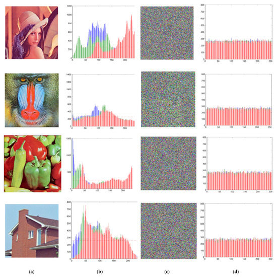 Histograms of colored plain images. (a) Plain images. (b) Histograms of plain images. (c) Cipher images. (d) Histograms of cipher images.