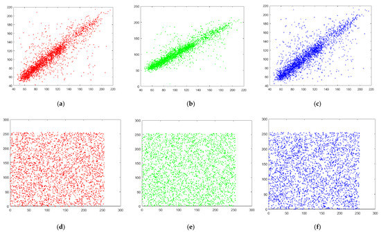 Correlation distribution: (a,d) Horizontal distribution in the red channel of the plain and cipher images; (b,e) Vertical distribution in the green channel of the plain and cipher images; (c,f) Diagonal distribution in the blue channel of the plain and cipher images.