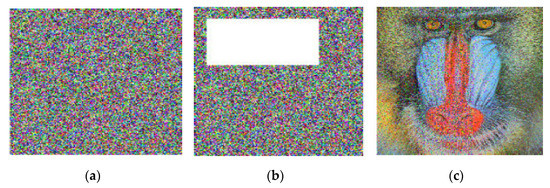 Data loss attack for Baboon image: (a) Cipher image; (b) Cipher image with a 70 × 180 data loss; (c) Decrypted Baboon image from (b).