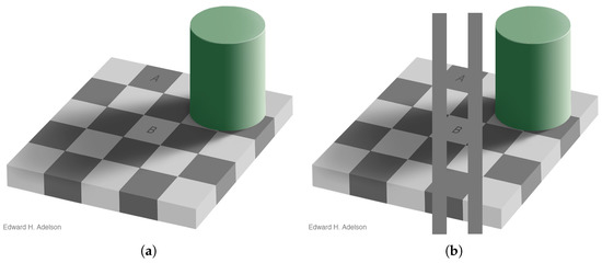 - Adelson, E.H. Checkershadow Illusion. 1995. Available online: http://persci.mit.edu/gallery/checkershadow (accessed on 1 November 2021).