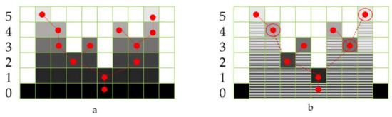 There are four major steps in the max-tree algorithm: (1) tree creation usually using maxima, (2) marking the nodes that do not meet the criteria, (3) filtering the nodes, and (4) image recovery [25]. The underlying concept of max-tree has been displayed in Figure 1. Imagine a 1-D image with gray levels: f = {0, 5, 4, 2, 3, 1, 4, 3, 5, 0} [56]. The double circles are max-tree composite nodes, and the leaves of both component tree and max-tree are related to regional maxima. Efficient implementations of extinction filters, and thus extinction profiles, are needed to take advantage of the max-tree concept.