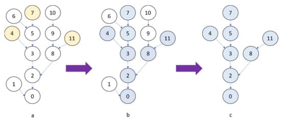 (a) The original tree; the yellow nodes show the nodes with the highest extinction values (b) Blue nodes represent the path from the three leaf nodes with the highest extinction values to the root (c) Results of the modification of nodes is not marked in blue.