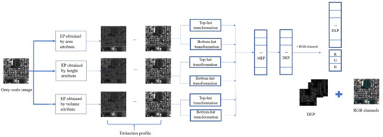 Extinction profile (EP) can produce a precise analysis of the input image. EPs are a series of thinning and thickening transformations, i.e., EFs, applied on a grey-scale image with progressively higher threshold values. In this manner, spatial and contextual information can be extracted from image comprehensively. If and denote the thinning and thickening morphological transformations, EPs can be described as a concatenation of them, as given by: