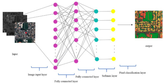 The deep network designed for the classification is straightforward. Inspired by [66], it constitutes an input layer, which, in this case, has 14 channels. The next two layers are fully connected layers. A fully connected layer is a layer in which the neurons connect to all the neurons in the next layer. The second fully connected layer combines the feature obtained by the first one to classify the image. Then, a softmax classification layer is used. The softmax activation function normalized the output of the previous layer. The outcome of this layer can be interpreted as classification probabilities by the final layer. The last layer is the classification layer that assigns each input to the mutually exclusive classes and computes the loss. The architecture of the proposed DNN is displayed in Figure 4. The final thematic map result is the output of this network.