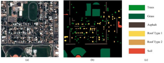The first dataset was acquired by Pleiades image. It is a subset of a pan-sharpened product from Pleiades image over Commerce City, CO, USA. The dimension of this data is 999 × 999 and the spatial resolution is about 0.5 m. The ground reference for this image is obtained by manual photo interpretation. The reference data contain six different classes of interest: trees, grass, asphalt, soil, roof type 1 and 2. The number of test and train pixels selected for the classification step is tabulated in Table 1. The original image, ground reference, and index of classes are displayed in Figure 5.