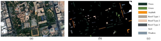 The second dataset was captured of the city of Riyadh, Saudi Arabia, by World-View 2. The size of the image is 1080 × 1920 at spatial resolution of 0.46 m. Similar to the Pleiades dataset, the ground reference of eight different classes was distinguished manually: Trees, grass, asphalt, roof type 1, 2, and 3, soil, and shadow. The roof classes were separated into three different types since they have different colours. The number of test and train pixels selected for the classification step has been tabulated in Table 2. The original image, ground reference, and index of them are displayed in Figure 6.
