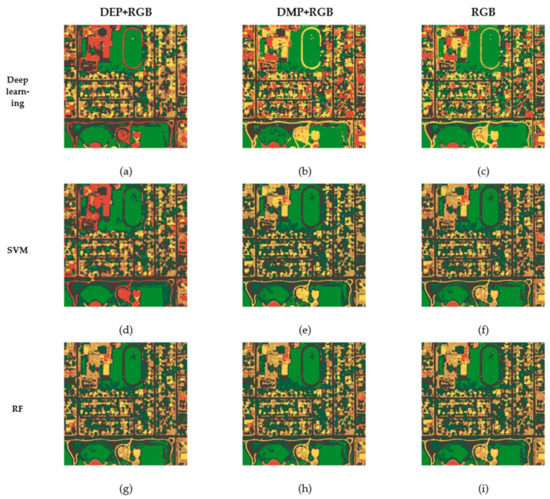 The classification results of (a) Deep learning with DEP + RGB (b) Deep learning with DMP + RGB (c) Deep learning with RGB (d) SVM with DEP + RGB (e) SVM with DMP + RGB (f) SVM with RGB (g) RF with DEP + RGB (h) RF with DMP + RGB (i) RF with RGB for Pleiades dataset.