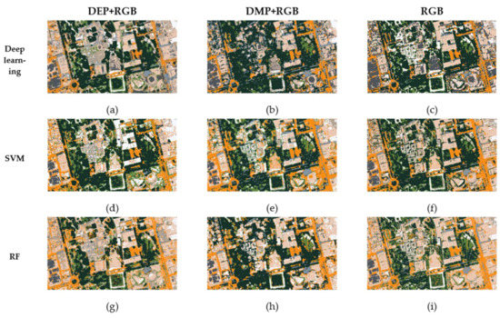 The classification results of (a) Deep learning with DEP + RGB (b) Deep learning with DMP + RGB (c) Deep learning with RGB (d) SVM with DEP + RGB (e) SVM with DMP + RGB (f) SVM with RGB (g) RF with DEP + RGB (h) RF with DMP + RGB (i) RF with RGB for World-View 2 dataset.