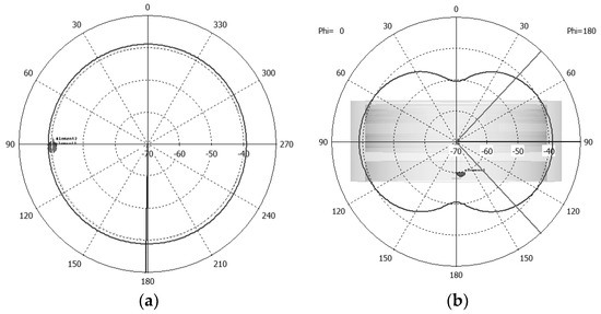 Simulated antenna gain at 13.56 MHz on the (a) xy-plane and (b) xz-plane of Figure 2.