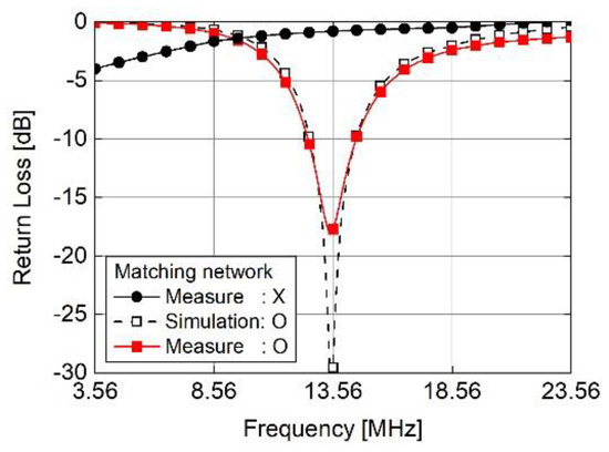 Figure 5 shows the return loss measured at the input of the 13.56 MHz coil antenna. Prior to the impedance measurement, the matching network, as shown in Figure 1, was tuned to match the antenna input to 50 Ω. As shown in Figure 5, the tuned matching network improved the return loss and reduced the loss occurring at the antenna input. Figure 5 also shows the return loss measured using the tuned matching network. Furthermore, it shows the simulated return loss. To obtain the simulated return loss, the return loss at the 13.56 MHz coil antenna was obtained from a numerical electromagnetic simulation for the antenna shown in Figure 2. CST Studio Suite was used for numerical simulations. The simulated return loss was imported to the ADS circuit simulator to simulate the return loss with the matching network implemented after the 13.56 MHz coil antenna. As shown in Figure 5, a similarity was observed between the measured and simulated return losses. The 13.56 MHz coil antenna had a bandwidth of approximately 2.5 MHz.