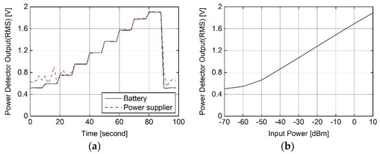 Figure 6a shows the measured power that was wirelessly transmitted from the Bluetooth module. For comparison, the power detector was powered by a battery and power supplier. The power supplier was operated with 220 V of grounded power. When the power detector was powered by the battery, the detector output increased linearly with an increase in the input power above −50 dBm. However, when the detector was powered by the power supplier, the detector output fluctuated at a low input power. This fluctuation was caused by the electromagnetic interference: the power supplier generated a conducted interference signal that fluctuated the power detector output, particularly when the input power was so low that the output voltage was also low. For channel measurements using the channel sounder, all components, including the power detector, were powered by a battery. Therefore, the fluctuation in the power detector output did not affect the overall performance of the channel sounder.