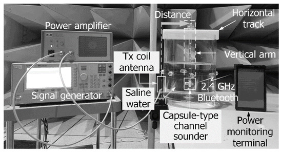 The out-body to in-body channel was measured using the fabricated channel sounder. Figure 7 demonstrates the setup used to measure the signal loss in the channel. The water tank consisted of saline water. For the measurement in this study, the out-body to in-body channel was mimicked using saline water, as described in [12,13]. Saline water has a conductivity similar to that of a real human body. Hence, the signal loss can be measured under conditions similar to those experienced by an implantable device located inside the human body. As shown in Figure 7, the capsule was placed inside saline water using a vertical arm that held the capsule-type channel sounder at its tip. Using the horizontal track, the vertical arm could be moved in the horizontal direction to adjust the location of the channel sounder. The signal generator, as shown in Figure 7, generated a 13.56 MHz continuous wave (CW) signal, and the generated signal was transmitted to the transmitting coil antenna. The transmitting coil antenna was attached to the surface of the water tank. The transmitted signal generated a magnetic field at 13.56 MHz. To increase the intensity of the magnetic field, the power amplifier amplified the 13.56 MHz signal before being transmitted to the transmitted signal generator.