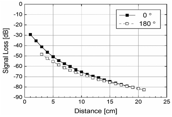 As shown in Figure 8, the signal losses were missing at distances of 1 and 2 cm because the 13.56 MHz coil antenna was located on the left side of the channel sounder, as shown in Figure 7. Consequently, the smallest distance between the 13.56 MHz coil antenna and the transmitting antenna was 3 cm. The signal loss was measured with a horizontal rotation of 90°. The measured signal loss was between that at rotation angles of 0° and 180°.